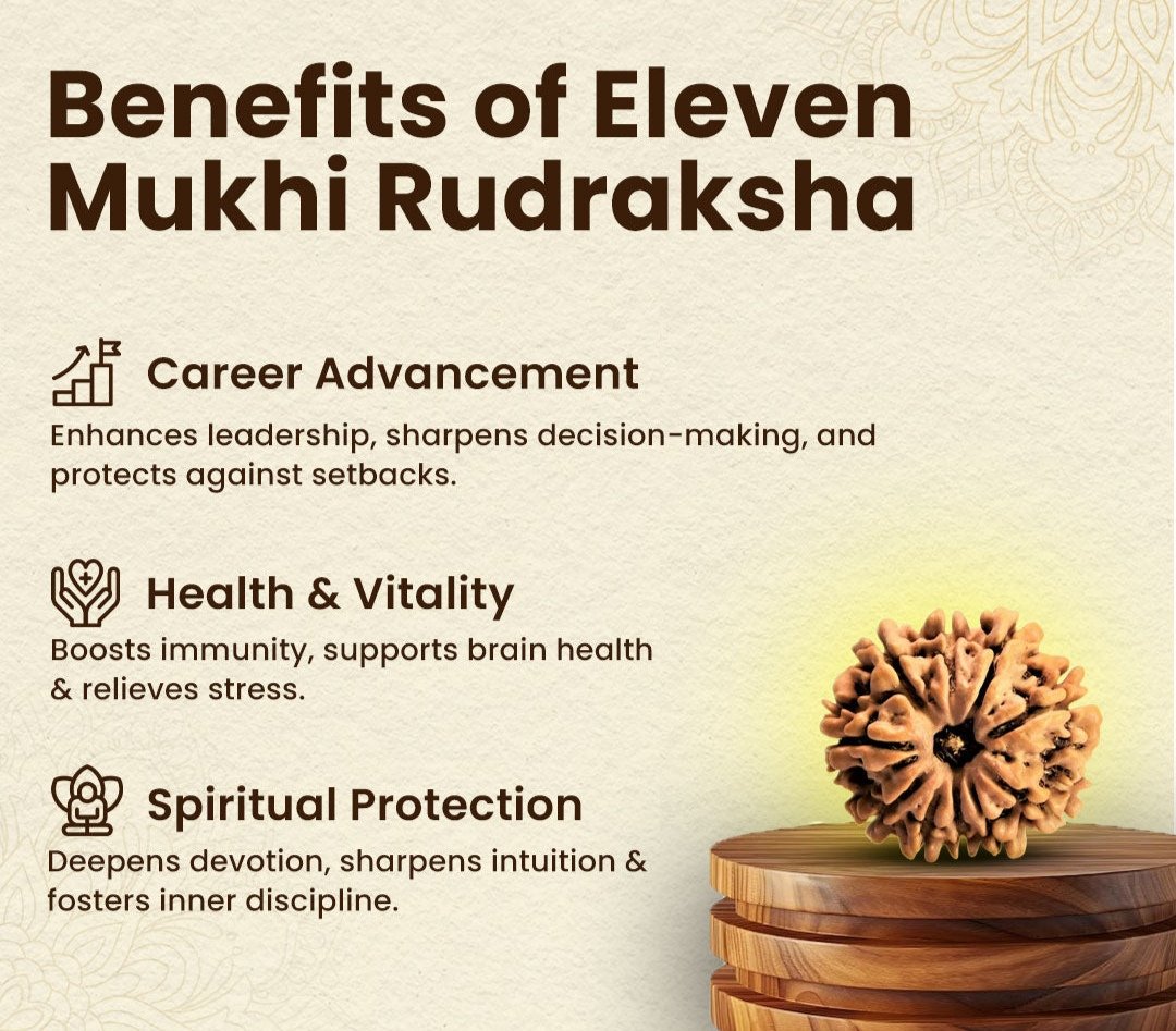 The?11 Mukhi Rudraksha, associated with the blessings of Lord Hanuman, represents courage, strength, and fearlessness. This Rudraksha is known for its immense power to eliminate doubts, insecurities, and mental confusion, allowing the wearer to face life?s challenges with unwavering confidence. It sharpens focus and improves decision-making abilities, making it ideal for professionals in high-stress roles, leaders, and students preparing for competitive exams. The 11 Mukhi Rudraksha also provides protection against negative energies and unseen obstacles, creating a shield of positivity around the wearer. In addition to its material benefits, this sacred bead enhances spiritual growth, devotion, and the ability to connect deeply with the divine. It inspires the wearer to develop a strong willpower, a sense of discipline, and an unshakable determination to achieve their goals. By wearing this Rudraksha, one can experience a harmonious balance of mind, body, and soul while progressing on both worldly and spiritual paths.