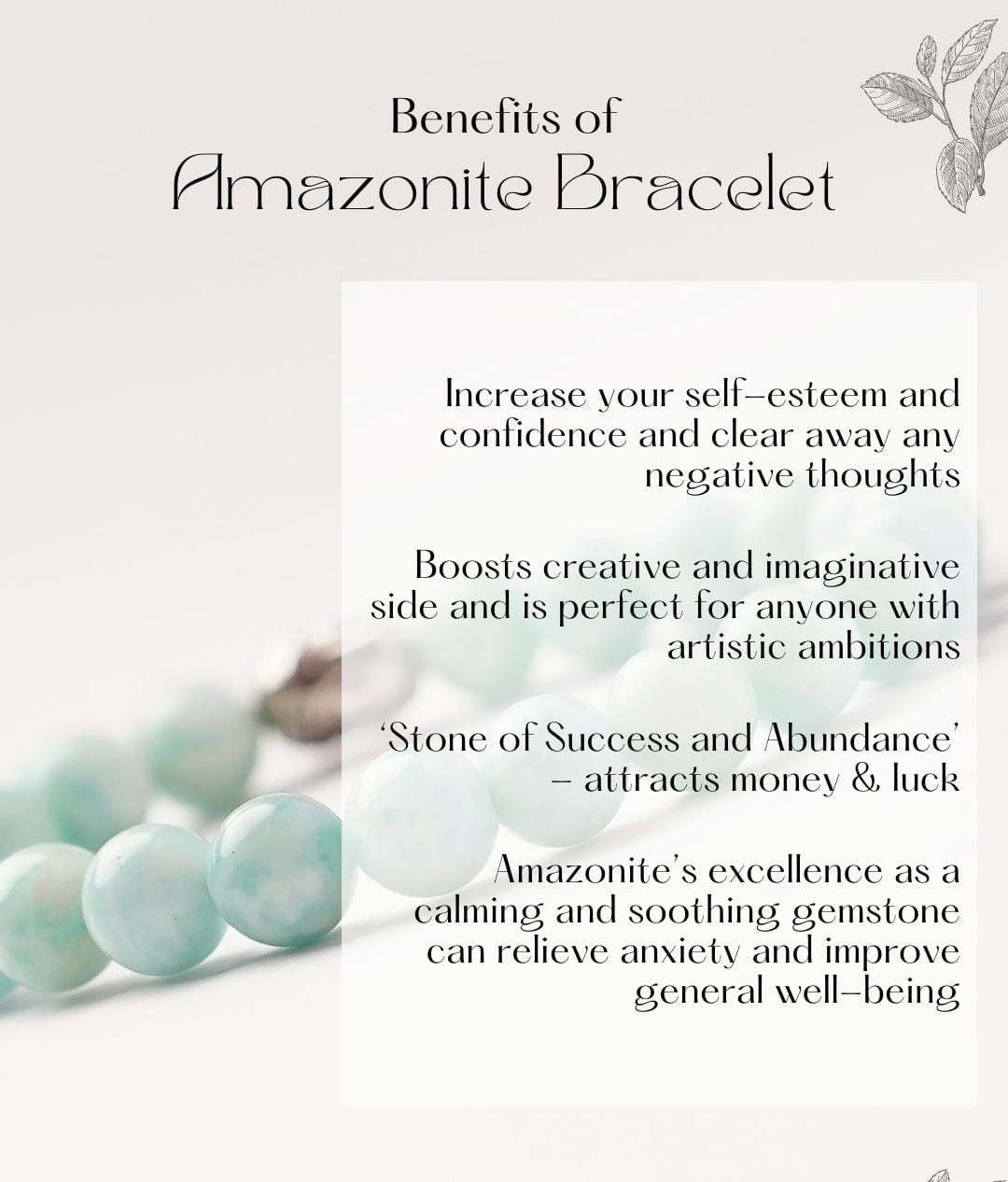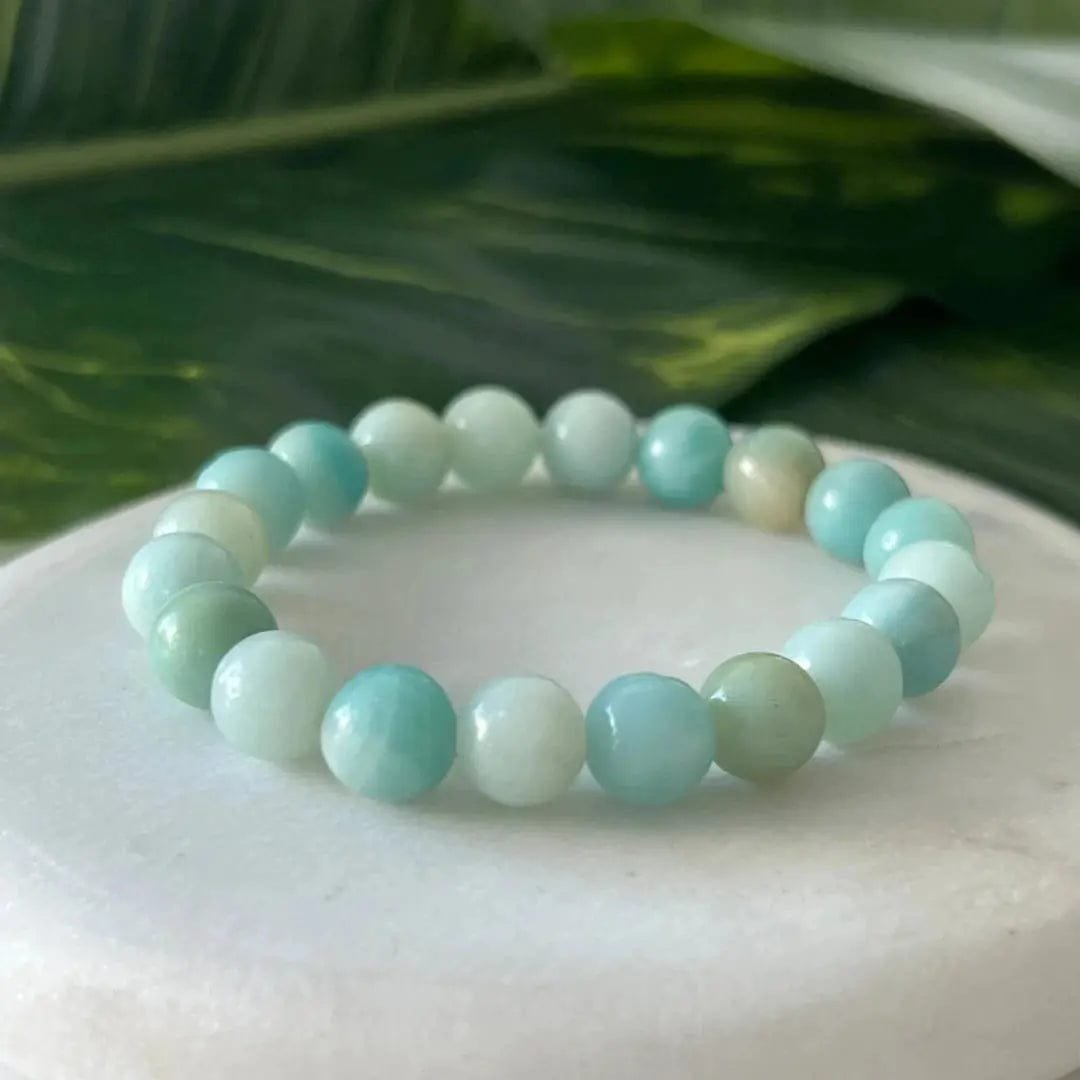 While there’s no scientific evidence, many believe wearing an Amazonite bracelet can: Soothes and Calms: Amazonite is believed to soothe and calm the mind and nervous system. Ease anxiety, fear, and worry, fostering inner peace. Promotes Communication: Amazonite is said to enhance communication and self-expression.