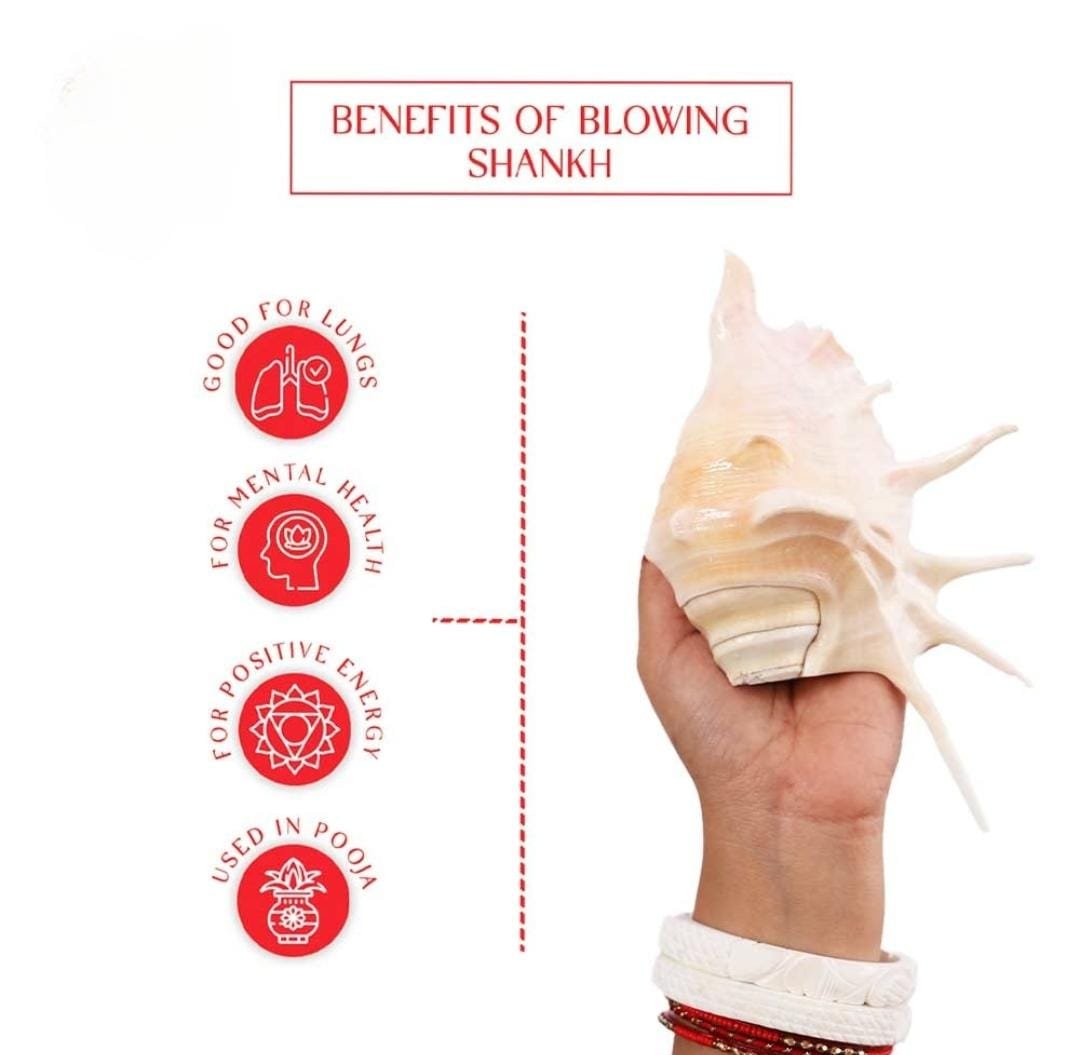 • Respiratory health: Blowing the shankh strengthens the lungs and diaphragm, improving respiratory strength and breath control.