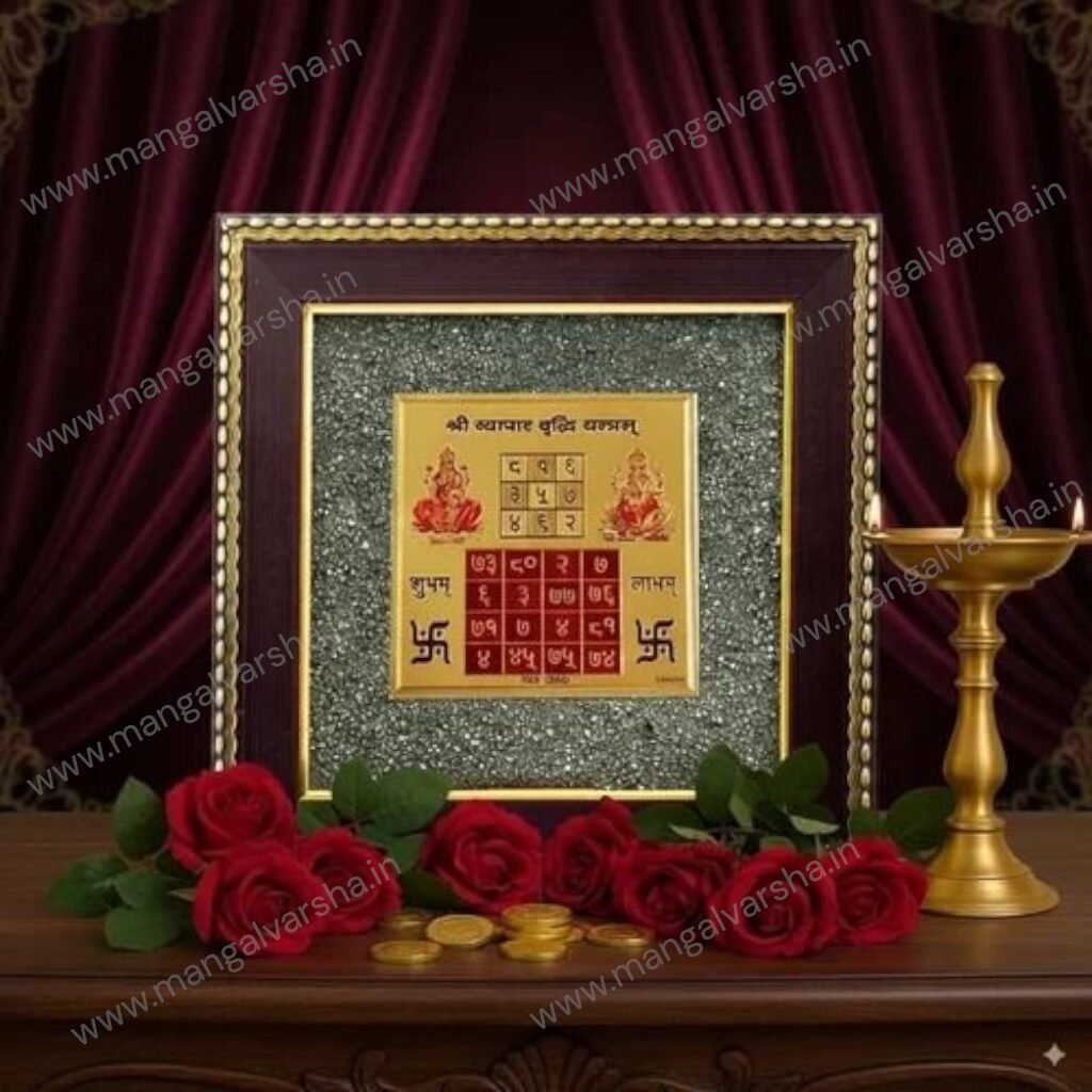 A pyrite frame with a Vyapar Vriddhi Yantra is believed to boost business by attracting new opportunities, increasing sales and profits, and removing obstacles. Its benefits include attracting wealth and prosperity, improving financial stability, and fostering a positive and success-driven atmosphere in the workplace. This combination is especially recommended for shops, offices, or businesses aiming for rapid growth and success.