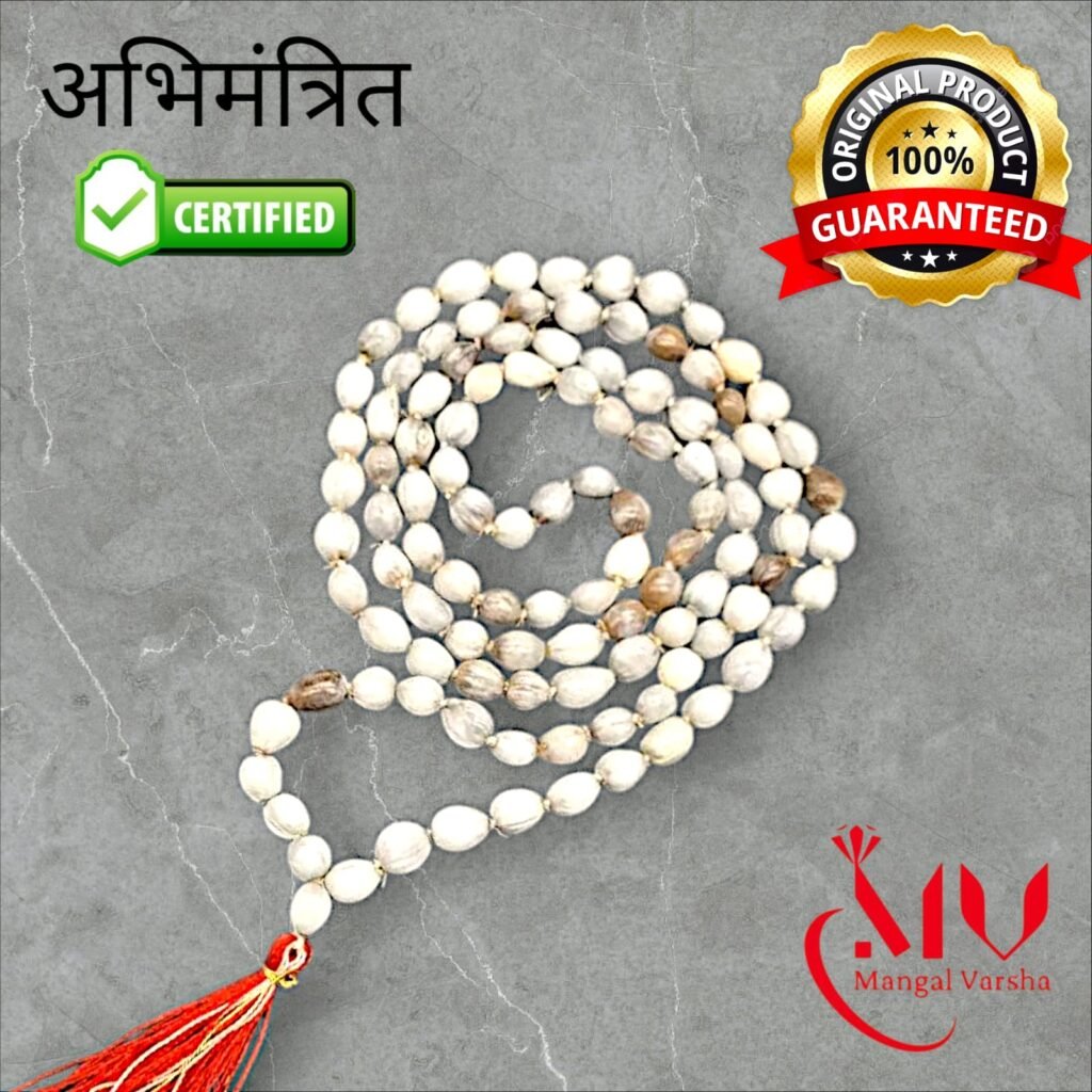 A genuine Vajanti Mala is made from natural white Vajanti seeds, which are smooth, lightweight, and have a slightly glossy finish. The beads should not have artificial coatings or unnatural colors. A real Vajanti Mala should feel cool to the touch and should have uniform, well-formed beads.